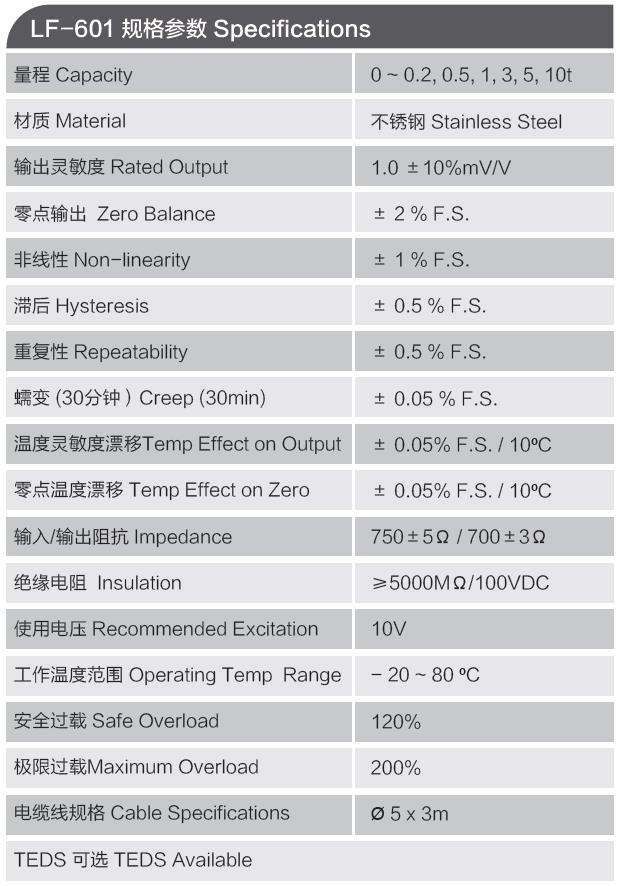 力准传感提供的柱式传感器具有高精度、高动态响应、大量程、体积小等特点。不锈钢材料,小体积使得具有较小的偏心误差。
